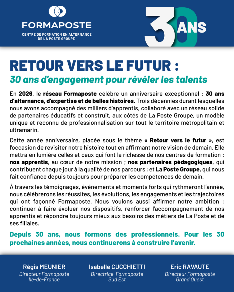 En 2026, le réseau Formaposte célèbre 30 ans d’alternance, d’expertise et d’engagement au service de la professionnalisation. Placée sous le thème « Retour vers le futur », cette année anniversaire est l’occasion de revenir sur trois décennies d’action tout en affirmant une ambition tournée vers l’avenir.